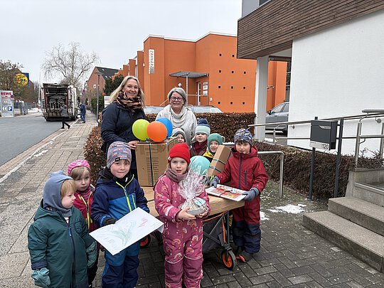 Am Mittwoch ging es dann weiter, die Kindergruppe Fidibus warte schon ganz gespannt vor unserer Praxistür.. Viele Kinder waren mitgekommen, begleitet durch die Erzieherinnen. Es war bunt und die Stimmung bei den Kindern bestens, der Bollerwagen war dabei ! In Absprache mit Frau Miriam Drieling und den Kindern war eine Sachspende vereinbart. Diese konnten wir nun übergeben, ein Karussell für outdoor. Der Bollerwagen war genau richtig. Wir haben ein schönes Bild, gemalt von den Kindern, bekommen und was zum schlickern! Vielen lieben Dank und tolle Karussellzeiten.